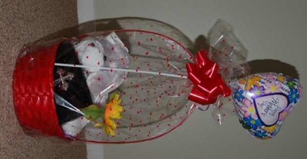 Instead of spending $10 on WalMart flowers, he ended up spending $20 on a basket with a stuffed dog, small clutch with a huge sparkly cross on it and a silk sunflower. Not satisfied with the silk sunflower in the basket, he also had to buy me a $3 red rose. It was classic!