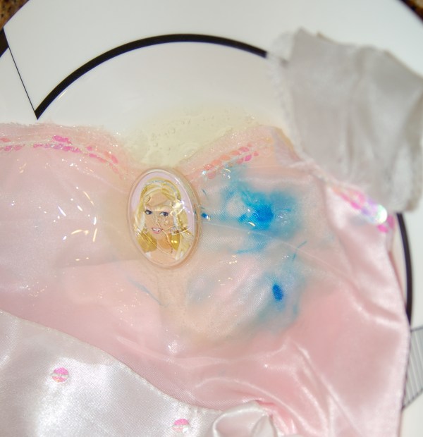 I put the marked up portion of the dress in a bowl and poured a little Murphy’s Oil Soap on it and was instantly amazed at what was happening before my eyes.  I saw the ink literally lifting up off the material and becoming a blue-ish goo. I hadn’t touched it, rubbed it or anything.  After a few seconds, I scratched at the ink with my finger and miraculously the rest of the blue ink came right out.  I was amazed.