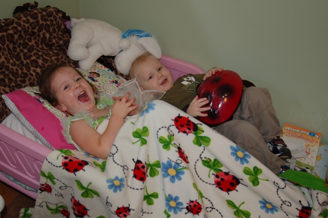 So I let the dog out and returned to the Little One’s room to find her and Super Y (Karen’s son) in bed, giggling. Oy vey!! Someone help me now!!