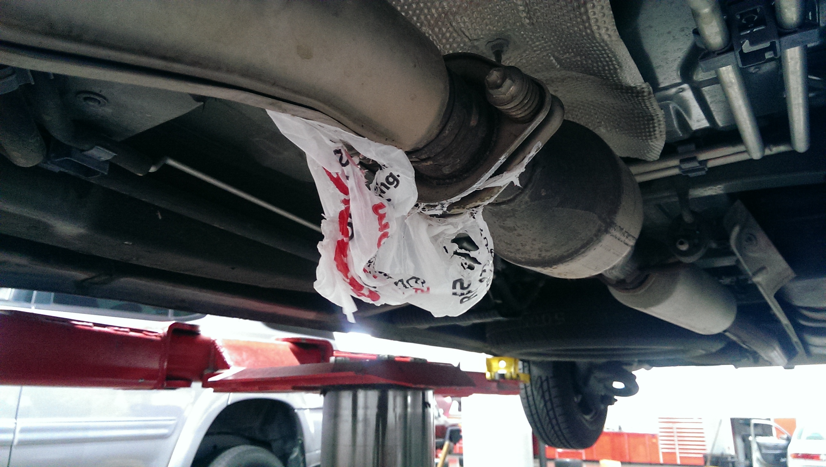 It started last week. After driving the MomMobile somewhere, I noticed a stinky burning plastic-like smell coming from under the car. I tried to ignore it. Then it happened again on Friday and Saturday. So on Saturday afternoon, I pointed it out to The Husband, who basically shrugged his shoulders and blew it off. Then on Saturday evening we went to dinner, upon returning home, I pointed out the smell again. This time The Husband acknowledged that it smelled a bit funky.