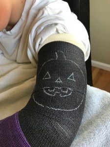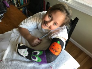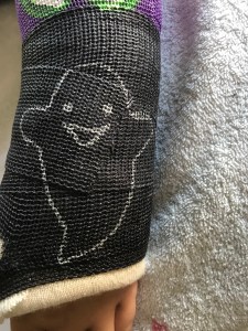 The Little One got a black and purple cast this time and asked for Halloween stuff painted on it so we went to work this afternoon. (side note she has now had a cast in every color that Kaiser offers!) I am not going to lie, my expectations for myself for very low. The Little One’s expectations for me where also very low (thanks kid!) But I surprised both of us with how well it all came out. They are clearly not difficult pieces. They certainly do not look professional. But hey they are readable. I think it’s pretty clear exactly what they are!