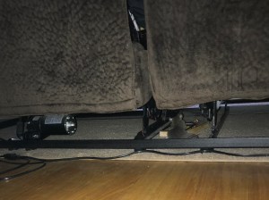 I think deep down I am an optimist, sometimes it’s hard to see that, so I grabbed the flashlight and began inspecting the floor where I have been finding droppings. I don’t see any. So, I go in for what has been the ultimate letdown for the last seven mornings. I lie down on the floor behind the couch and shine the light. As the light bounces around under the couch, something it different. The bright yellow bait square is what I usually see. I don’t see yellow….
